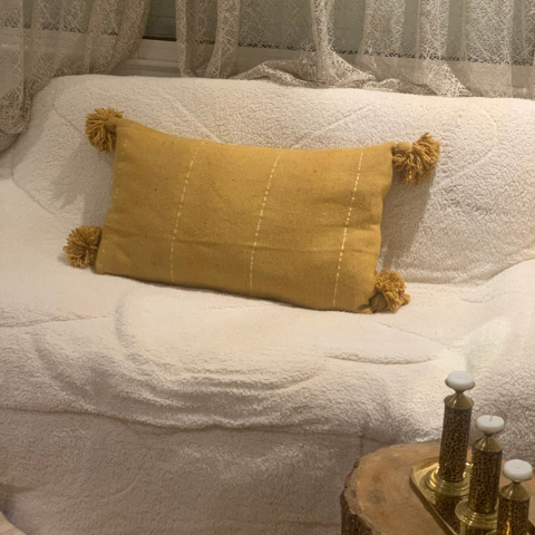 Coussin rectangulaire à rayures, conçu à la main à partir de la laine. Modèle disponible en jaune et en gris avec pompons.