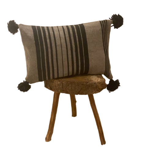 Rectangular striped cushion, handcrafted from wool. Available in yellow or in gray with pom-poms.
